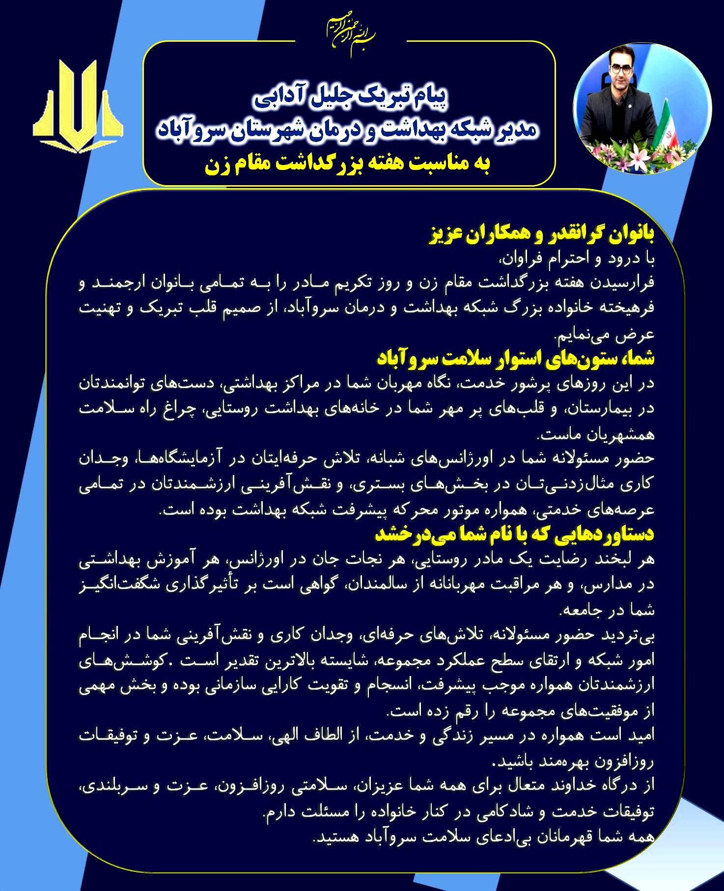 جلیل آدابی مدیر شبکه بهداشت و درمان شهرستان سروآباد به مناسبت هفته گرامیداشت مقام زن پیامی منتشر کردند.
