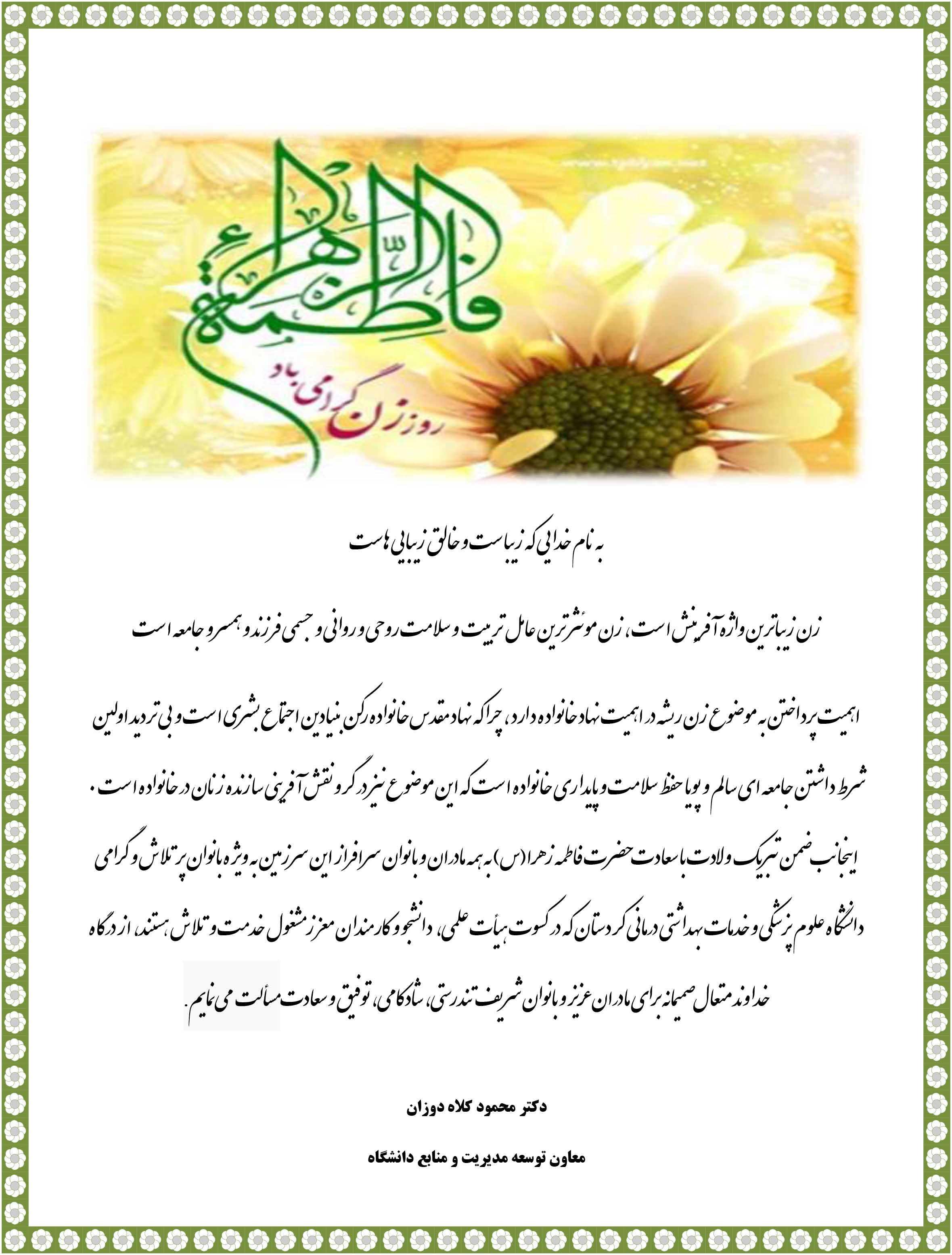 دکتر محمود کلاه دوزان معاون توسعه مدیریت و منابع دانشگاه در پیامی ولادت حضرت فاطمه زهرا (س) و روز مادر را تبریک گفت :