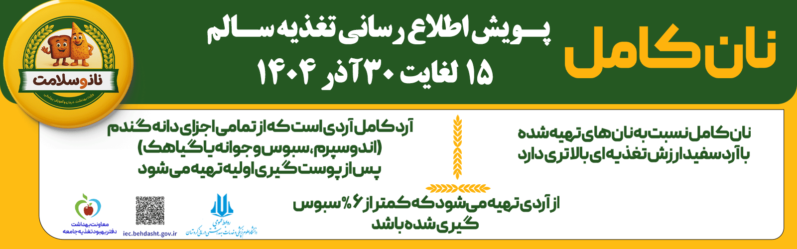 به گزارش روابطعمومی دانشگاه علوم پزشکی کردستان، پویش ملی اطلاعرسانی تغذیه سالم امسال با محوریت «نان و سلامت» و با همکاری گروههای بهبود تغذیه دانشگاهها و سازمانها و ارگانهای ذیربط از ۱۵ لغایت ۳۰ آذرماه در سراسر کشور برگزار میشود.