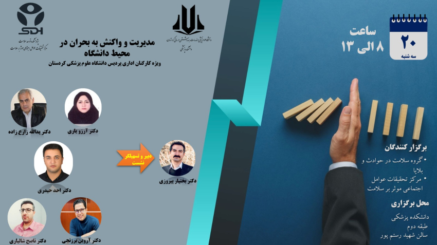 کارگاه آموزشی یکروزه با عنوان «مدیریت و واکنش به بحران در محیط دانشگاه» روز سهشنبه، ۲۰ آبانماه ۱۴۰۴، به همت دپارتمان سلامت در حوادث و بلایا و مرکز تحقیقات عوامل اجتماعی مؤثر بر سلامت (SDH) و با پشتیبانی معاونتهای آموزشی و فرهنگی دانشگاه علوم پزشکی کردستان برگزار شد.